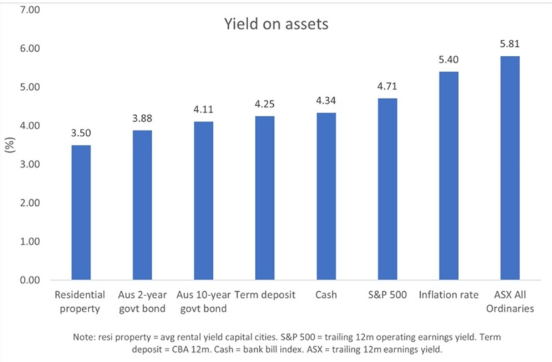 Average 3.5% yield on residential property is well below the 10-year Government bond. It’s also below what you can get from cash and a term deposit. And it’s way lower than the current inflation rate.