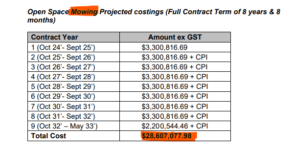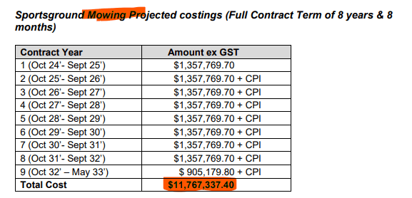 Mowing contracts awarded add up to $44,000,000 ( million) inclusive of GST but before CPI ( 31 million for open spaces and 13 million for ovals) and if right this moment you are reconsidering your career choices, drafting resignation letter or Googling finance for a ride-on mower I don’t blame you.