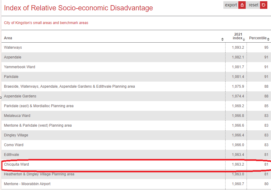 **City of Kingston Socio-Economic Index (SEIFA) measures unemployment, low incomes or education levels, single parent families, low skilled occupations, poor English proficiency and whilst in 2021 our Ward was a relatively safe to live, this is no longer the case in 2024.